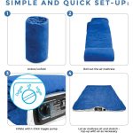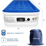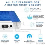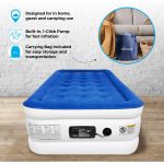 Premium “double-height” raised air bed design with dual chamber construction measures 80″ x 60″ x 19″, offering spacious comfort for two or a king-sized experience.