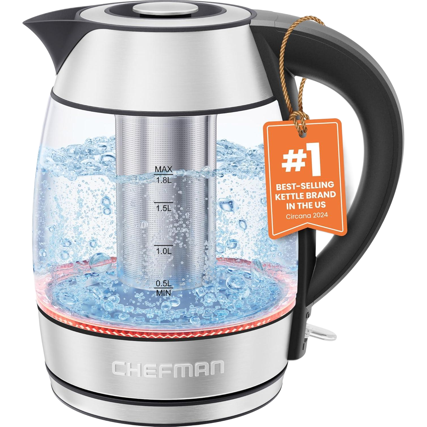 • Chefman Glass Electric Kettle for Boiling Water, 1.8L 1500W, with Tea Infuser, Keep Warm Function