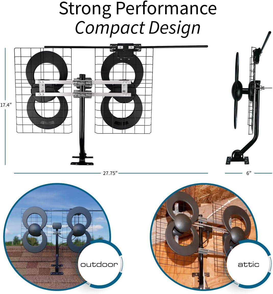Easy top-of-TV mount enhances convenience and signal quality.